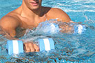 Pair of PE foam dumbells with soft hand grips, for aquafitness activities.