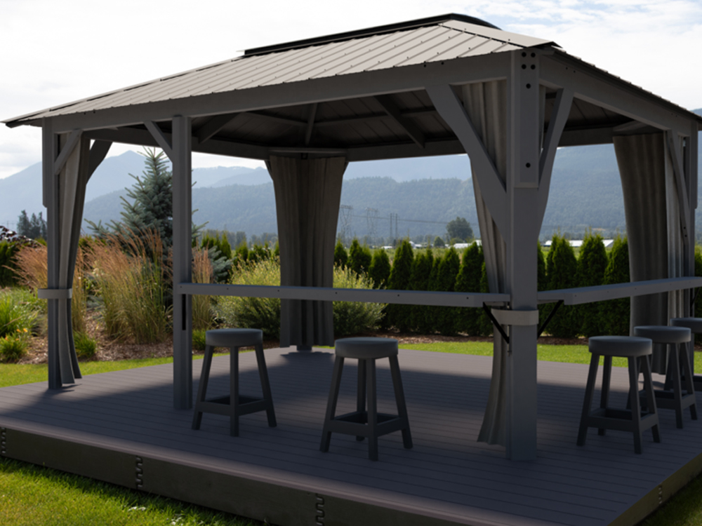 Nothing brings the party to your backyard like our bar and stools. The stools are made of painted Western Redcedar and have a water-resistant soft vinyl cusion. The bar is a perfect resting spot for your favourite refreshment. Add candles at night for a great warming touch.